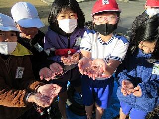 そんな寒い中でも、朝のボランティアに出かけた子どもたちでしたが、なにやら手に光るものを持っていました。そうです、前日までの雨でできた水たまりに氷がはっていたのです。