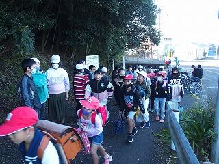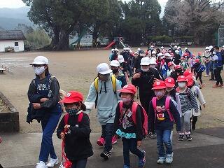 1年生と6年生のペアが先頭になり、目的地の的野農村公園、富吉小学校に向けて出発しました。