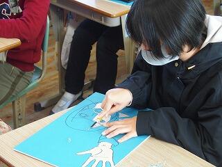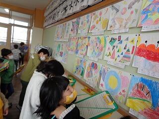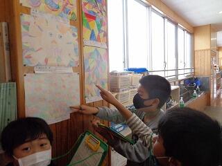 「色の塗り方の工夫」「線の組み合わせ方」など友達の作品の素晴らしいところを発表していました。