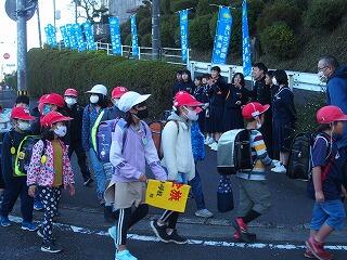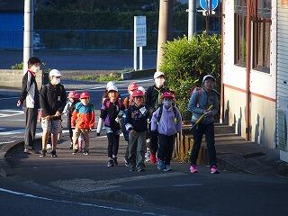 通学路では、地域のボランティアの皆様に見守られ、安全に登校できています。集団登校の班長・副班長さんも、班の友達を安全に導いてくれています。