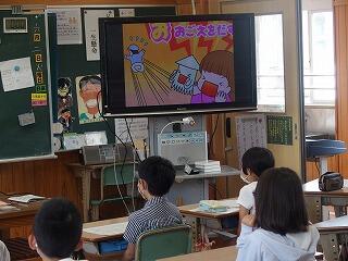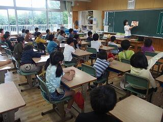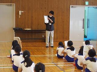 次に、「ともだちって みんなが いっちゃったあとも まっててくれるひと。ともだちって そばにいないときにも いま どうしてるかなって おもいだすひと。・・・」と、谷川俊太郎さんの詩と、和田誠さんのほのぼのとしたイラストによる絵本『ともだち』を紹介されました。一つ一つの言葉は素朴ですが、なんだか心に染みてくる詩です。さっそく1校時の図書の時間に、この『ともだち』を探していた子もいました。