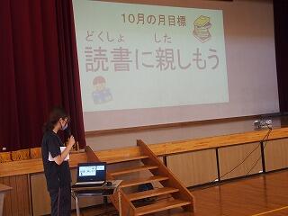 10月の生活目標「読書に親しもう」について図書主任が話をしました。10月の図書室は読書ビンゴ、読み聞かせ等イベントがたくさん開催されます。