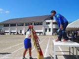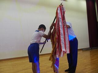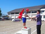 これまでは、体育科の授業で使うポートボール台を表彰台の代わりに使用していましたが、子どもたちにとって晴れの舞台であり、これまでの頑張りを認める意味でも、本物の表彰台で、ぜひ小優勝旗を受け取ってほしいという職員の思いもあり、教育委員会教育総務課に相談しましたところ、快く引き受けてくださり、営繕担当の皆様に作成していただきました。とても立派な表彰台で、「靴を脱いで上がるんですか?」と聞いてくる子どももいました。