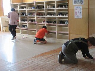 室内のそうじもしっかりと!先生たちもひざをついて丁寧に雑巾がけをしています。もちろんトイレもぬかりなく。