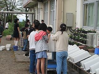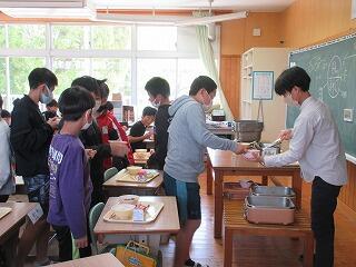 3年生は、事務の先生たちが応援に駆けつけています。自分たちで注ぎ分けるのが上手になってきましたが、アドバイスをもらいながらやっていると無駄がなくスムーズに作業が進みます。当番ではない子は席に着いて当番が配膳するのを静かに待ちます。