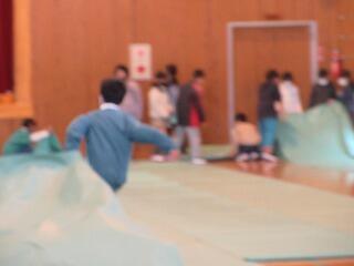 5年生は、会場のマットを片付けます。たくさんあるから急いで急いで。
