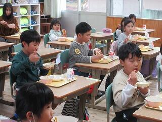 5年生、食べる姿勢がいいですね。しっかり皿を持って食べているので背筋が伸びています。さすが高学年。