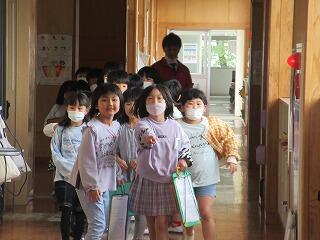 今日は、地区集会がありました。給食の後、各地区に分かれて集合場所や時刻の確認、登校中に気を付けることなど担当の先生と話をした後、運動場に集まりました。登校班で登下校することで学校から家までの順路を覚えます。