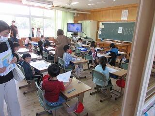 みんななかなかいい姿勢で話を聞いているようです。4時間という1年生にとって長い時間が終わったら、給食です。(給食の様子は、明日ご紹介します。)