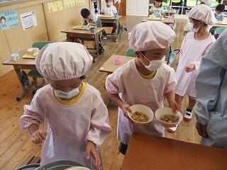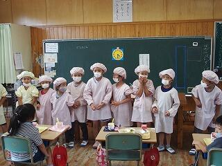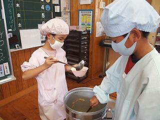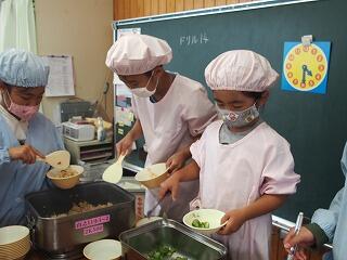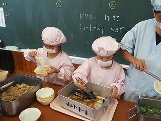今週から1年生も給食当番を頑張っています。これまでは、給食の運搬、配膳等を全て6年生にやってもらっていました。今週からは6年生のお手伝いを4人にして、1年生が給食当番をやっています。