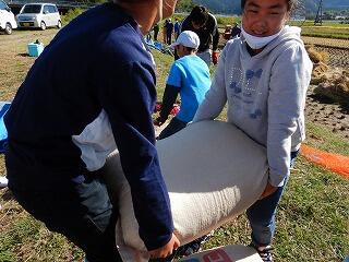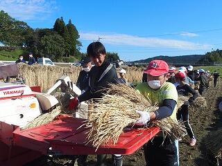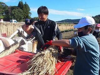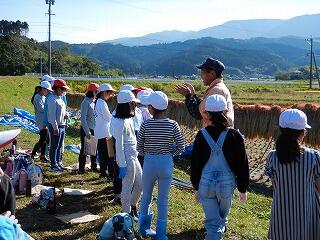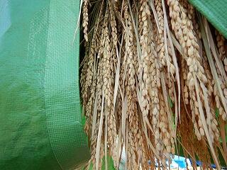 今日の1時間目から、5年生は先日稲刈りをして干していた稲の脱穀作業を行いました。天気にも恵まれ、松山さんをはじめ多くのボランティアの方々の御協力をもらい、機械を用いての脱穀作業となりました。