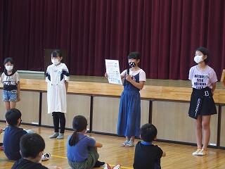 環境美化委員会は、そうじの仕方とごみの分別について発表しました。そうじの約束「さしすせそうじ」(さっさと、しずかに、すみずみまで、せいいっぱい、そろえて)について寸劇を交えながら、「しっかり約束を守ってそうじをしましょう。」と呼びかけをしました。