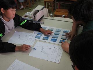 空の写真がたくさん載っている紙を見ながら何やら相談中です。それぞれの写真の特徴を見つけているようです。