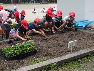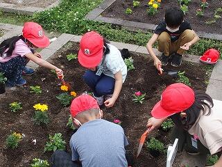 今週は水曜日から金曜日まで雨の予報でしたので、多くの学年が中庭に出て花植をしました。