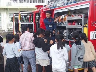 その後、消火器の使い方を学習し、代表児童が消火訓練をしました。