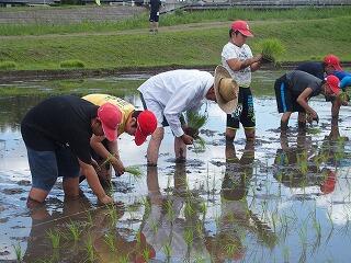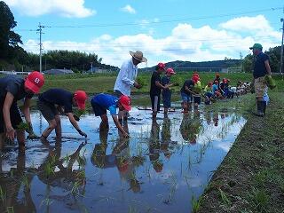 子供たちにとって、生まれて初めて体験する田植えでした。苗を5本の束にちぎるのが難しかったり、どろどろの田んぼに足を取られて尻もちをついたり、苗をキャッチできずに顔までどろで汚れたりしながら、一生懸命がんばって取り組んでいました。子供たちにとって学びの多い田植え体験学習でした。