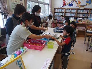 山之口小学校の子ども達がたくさんの本に親しめるように、図書室の設営、図書の整理、給食時間の読み聞かせ、ブックイベントの計画・実施と大活躍です。