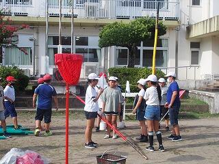 まず、閉会式の練習をしました。本年度の閉会式は、熱中症予防のため、短時間で実施するだけでなく、子どもたちの位置も児童テントの中になります。テント内の様子を見ると、今日が初めてでしたが、距離をとって整列することができていました。