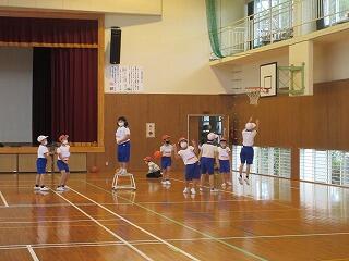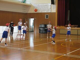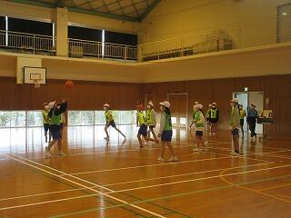 別の日に体育館でポートボールをしていました。台に載った子がバスケットボールのゴールの代わりです。