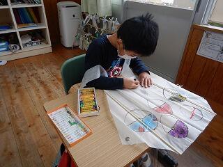 描いているときから、「はやくあげたいな~。」「いつ外に行くんですか。」「風吹いているかな。」など、楽しみにしているようでした。