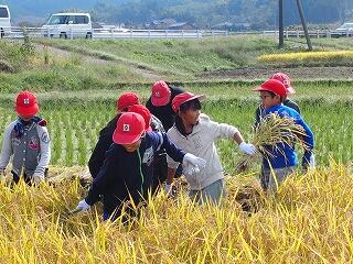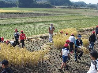 秋晴れの中、学習支援ボランティアの方やJA青年部の皆様、保護者の皆様にご協力をいただきながら、2時間かけて、手刈で行いました。