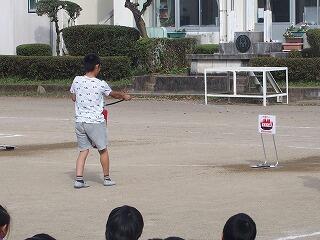 その後、消火器の使い方を学習し、代表児童が消火訓練をしました。