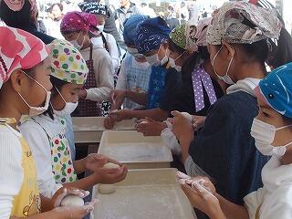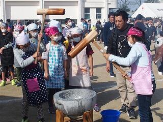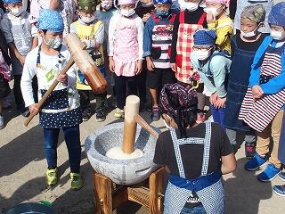 収穫祭では、保護者の皆様のご協力のもと、5年生が栽培・収穫したもち米でもちつきをしました。低学年は、杵を保護者の皆様の力を借りながら持ち上げ、ぺったん、ぺったんとがんばってつきました。上学年は、自分たちの力でがんばっていました。