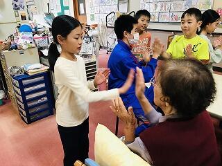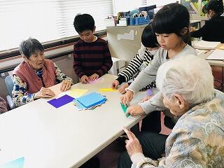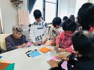 一緒に茶つみの音楽に合わせて手をたたいたり、折り紙を折ったり、あやとりをしたりしました。おじいちゃんおばあちゃんからも笑顔で接してもらい、子ども達はとても嬉しそうでした。