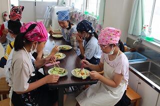 7月5日(月)に6年生は、家庭科で調理実習を行いました。実習では、野菜炒めやスクランブルエッグを作りました。卵のゆで時間を3分、5分、10分、15分に分けてどんな違いがあるか確かめていました。