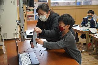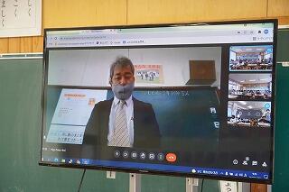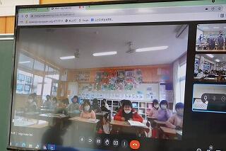 オンラインでつないだ途端に、他の学校の子どもたちや自分たちがテレビ(モニター)に映っている姿に子どもたちは大盛り上がりでした。