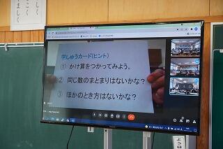 学習内容は、算数科「かけ算をつかって」です。色々な考えを出し合う授業で、麓小学校や富吉小学校の友達の意見を取り入れながら考えを深めることができました。