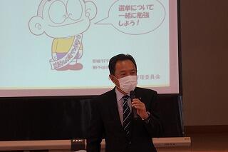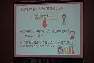 各種選挙における市の投票率の現状や、選挙は何のために必要なのか、選挙に行かないとどんなことになるのか等、クイズも交えながら分かりやすく教えていただきました。