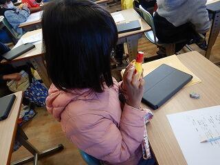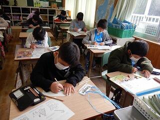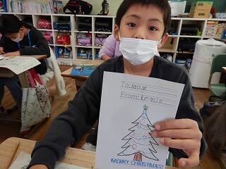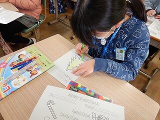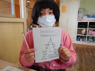 3年生は、12月21日(火)の外国語活動では、これまでに学習してきた「形」を使って、クリスマスツリーのかざりを描き、クリスマスカードを作成しました。クリスマスカードを誰に渡そうかと考えなが色塗りをしていました。