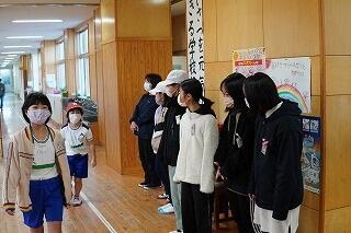 そこで、校内あいさつ運動をしようということになり、11月下旬から7つの委員会が1週間交代であいさつ運動を行っています。