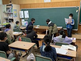4年生は総合的な学習の時間で、山之口町の民話について学習しています。「弥五郎どん」や「おなみが池」「くわず芋」など、いろいろなお話から1つ選び、自分たちで分かりやすく劇や紙芝居にしました。今日は、作った劇や紙芝居を他のクラスに発表しました。