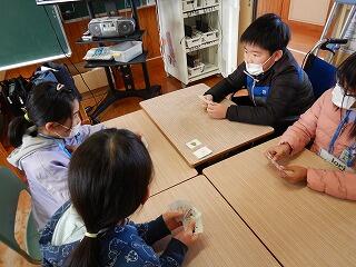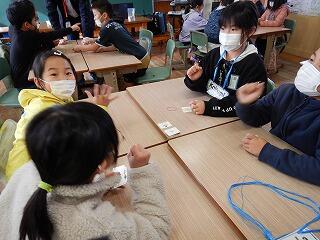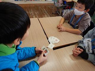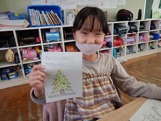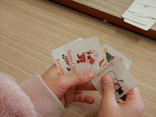 また、ALTのリチャード先生手作りのクリスマスバージョン「ウノ」をしました。「ウノ」が初めての子どもたちもいて、最初は不安そうでしたが、ルールが分かると楽しそうに「グリーンエルフ!」「スキップ!」「レッドクリスマス」など、カードに書かれている絵を見て、英語に親しみながら活動することができました。