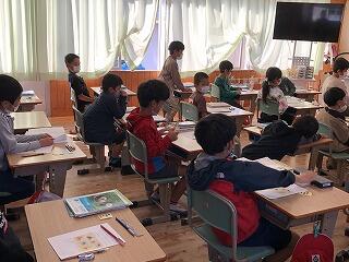 導入部分では、「何だか嬉しいと思うとき」はどんな時か、各自が考えたことを発表しました。講師の先生が「発表を聞いたら、みんなで『何だか嬉しい』と言いましょうね。」と言われたことで、最初は挙手する子どもは2人しかいませんでしたが、2人が発表した後は、次々に手が挙がり、「お金をもらったとき」「友だちとおしゃべりしているとき」「人に優しくされたとき」などたくさんの意見が出ました。