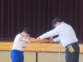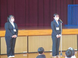 その後、先月末から南九州大学から教育実習に来ている学生さんの自己紹介がありました。1学期や運動会でも会っていたので、子どもたちは緊張した様子も無く、にこにこしながら話を聞いていました。