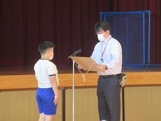 体育館に全校児童が集合して行うのは、本年度に入って初めてです。新型コロナウイルス感染防止のため、一人一人の間隔を1m以上空けて整列しました。