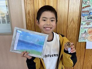 とても上手に出来上がった絵を見て満足そうです。周りの人にも「うまい!」「どうやって描いたの?」と褒められて嬉しそうでした。
