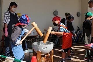 5年生は、先日実施したオープンスクールで、餅つきをしました。