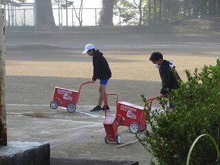 ふと見ると、ラインカーを使っている子がいました。この日は、本年度最初の長距離走の練習日。低・中・高学年でコースを分けて運動場を走ります。体育委員会の子がそのコース分けのためのラインを引いていたのです。