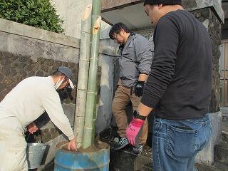 まずは、取ってきた竹の長さを合わせ、上部を斜めに切ります。本年度は電動のこぎりが登場し、作業がテンポよく進みます。