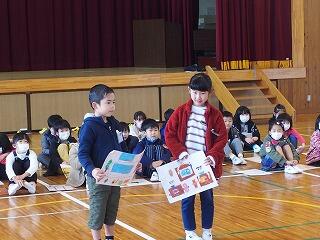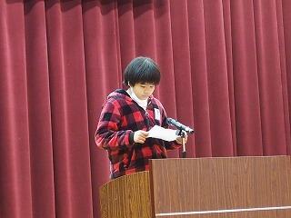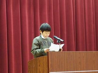 得意な教科をさらに伸ばしたい。苦手な教科をがんばる。委員会活動や朝のボランティアをがんばるなど、3学期にがんばることや今年の目標を2名の児童が発表しました。