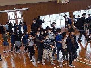 今日は5年生の奴踊りの練習2回目でした。講師に保存会の会長さんに来ていただき、一つ一つの動きをていねいに教えていただきました。