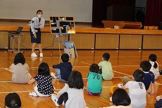 今日は、図書館サポーターの津曲先生が「ノラネコぐんだん パンこうじょう」と「ぞうさんのおとしあな」の2冊の本を読んでくださいましたが、みんな熱心に話に聞き入っていました。