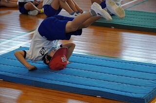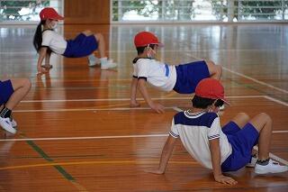 今日は1年生が体育科の授業で、体つくりの運動遊びやマットを使っての運動遊びをしていました。