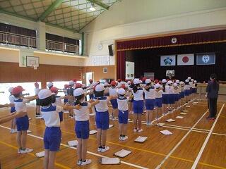 5月10日、3時間目の体育の時間に、3・4年生合同でシャトルランを行いました。まず始めに、整列です。素早く並ぶことができました。4年生は、3年生のお世話係です。「よろしくお願いします。」