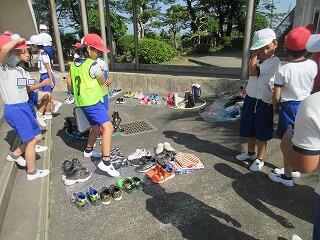 全体指導の後は、6年生を班長に縦割り班で行動します。いろいろな種目があるので班ごとにスタート地点が違います。体育館で行う種目からスタートする班は、水筒はフラフープの中に、靴はビニール袋の上にまとめておきます。こうすると、体育館での種目が終わった後、低学年でも迷わずに自分の持ち物を見つけることができます。