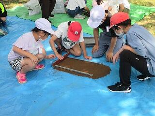 火起こし体験の様子です。当日は雨が降って湿度が高く、なかなか上手くいきませんでしたが、根気強く友達と協力する姿が見られました。